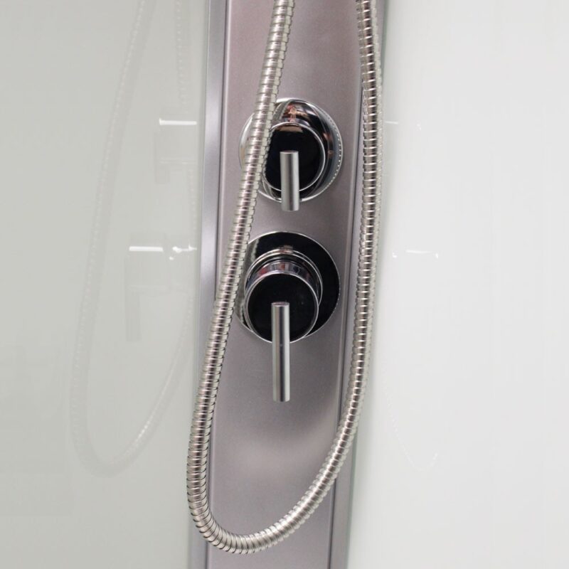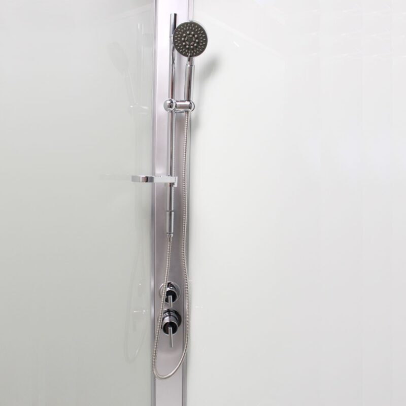 Sprchový box vnáša do ekonomickej triedy nový rozmer kvality. Sklo je v dizajne Point, satin ALU profil. Hrúbka bezpečnostného skla je 5/4 mm. Sklo je dokonale utesnené silikónovými lištami.Nejedná sa však o hermeticky uzavretý výrobok. Sprchový kút je osadený posuvnými dverami, ktoré majú kvalitné dvojkolieskové horné pojazdy s možnosťou perfektného nastavenia. Dorazy zaisťujú minimálne nárazy pri otváraní a zatváraní sprchovacieho kútu.Spodné pojazdy umožňujú odklopenie posuvnej časti sprchovacieho kútu a vyčistenie bežne nedostupných miest. Tesnosť medzi pevnou a posuvnou časťou je zaistená silikónovými lištami. Na pripojenie boxu je možné použiť nerezové opletové hadičky, ktoré nájdete v našej ponuke (súčasťou balenia sú nerezové pripojovacie hadice 1/2 „s dĺžkou 60 cm).Sprchové vaničky z liateho mramoru sú opatrené ochrannou vrstvou Gelcoat, ktorá zaisťuje stálofarebnosť, odolnosť proti nárazu zároveň predstavujú nadčasové a elegantné riešenie:- ľahká údržba- vysoká odolnosť- nadčasový materiál- otvor pre sifón ø 90 mmVaničky sú vybavené protiskluzovou úpravou.Vybavenie boxu:- vstavaná batéria- ručná sprcha s posuvným držiakom- vanička liaty mramor vč. nožičiek a panelu- sifón- zadná stena – sklo – *hlavová sprcha (variant so strieškou) Nosnosť vaničky je 150 kg. Ean: 8596462579984
