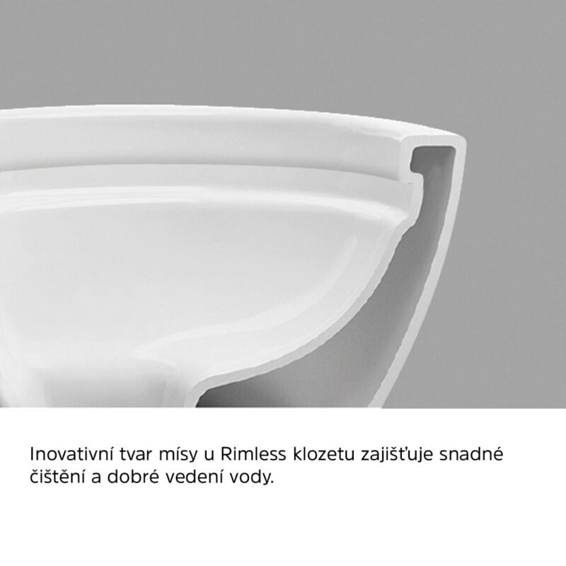 Rimless je inovatívny spôsob oplachu WC klozetu. Premyslený spôsob vedenia vody zaisťuje účinný oplach toalety a taktiež ľahké čistenie WC misy.Vďaka novému tvaru misy odpadá zložité čistenie splachovacieho žliabku pod okrajom misy, ktorý je používaný na klasických WC, a kde by sa mohli hromadiť baktérie, špina a usadeniny.Samozatváracie WC sedadlo má nerezové, nastaviteľné úchyty, ktoré je možné prispôsobiť rozmerom misy.Pomocou hydraulického systému veko aj sedadlo pomaly dopadajú na misu. Tento systém dodáva pocit komfortu a zabraňuje poškodeniu misy aj sedátka. Nerezové pánty uľahčujú údržbu a predlžujú životnosť.- antibakteriálna povrchová úprava- soft close: samozatvárací systém (pozvoľné sklápanie sedátka i veka)- easy lock: systém umožňujúci jednoduchým stlačením odňať WC sedátko od misy (zvyšuje úroveň hygieny toalety) Ean: 8596462573562