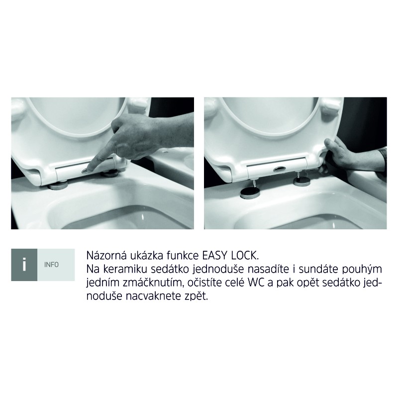 Rimless je inovatívny spôsob oplachu WC klozetu. Premyslený spôsob vedenia vody zaisťuje účinný oplach toalety a taktiež ľahké čistenie WC misy.Vďaka novému tvaru misy odpadá zložité čistenie splachovacieho žliabku pod okrajom misy, ktorý je používaný na klasických WC, a kde by sa mohli hromadiť baktérie, špina a usadeniny.Samozatváracie WC sedadlo má nerezové, nastaviteľné úchyty, ktoré je možné prispôsobiť rozmerom misy.Pomocou hydraulického systému veko aj sedadlo pomaly dopadajú na misu. Tento systém dodáva pocit komfortu a zabraňuje poškodeniu misy aj sedátka. Nerezové pánty uľahčujú údržbu a predlžujú životnosť.- antibakteriálna povrchová úprava- soft close: samozatvárací systém (pozvoľné sklápanie sedátka i veka)- easy lock: systém umožňujúci jednoduchým stlačením odňať WC sedátko od misy (zvyšuje úroveň hygieny toalety)