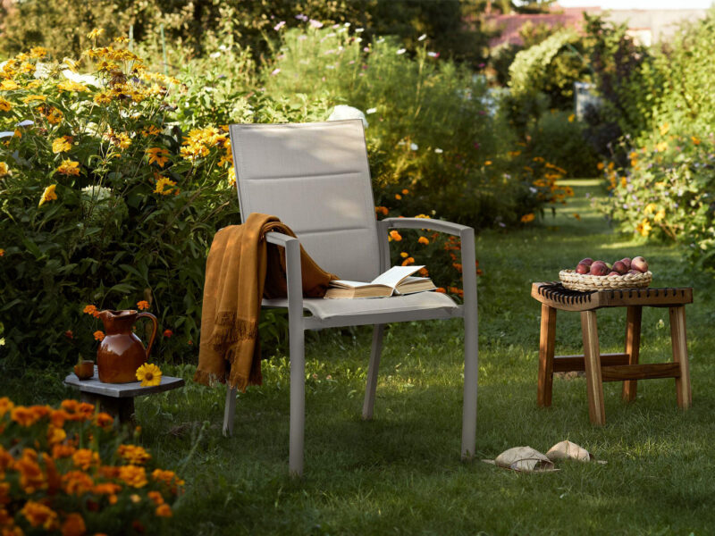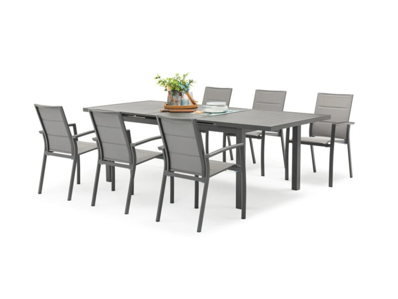 Stolová súprava Merida ponúka pohodlné sedenie a priestranný jedálenský stôl s rozšíriteľnou funkciou. Hliníkový rám v antracitovej farbe, odolné sedáky a opierky a doska stola zo sinterstone materiálu vytvárajú odolný a estetický celok pre exteriér.