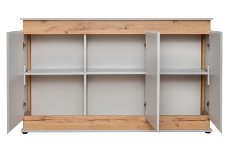 Merlin komoda je funkčný kus nábytku so štíhlym korpusom a neutrálnou farebnou kombináciou.K dispozícii sú tri otváravé dvere s bezúchytkovou konštrukciou. Každá z nich poskytuje odkladaciu policu. Vrchná čast komody môže poslúžiť ako ideálne miesto pre dekorácie, drobnosti a okrasné rastliny.Komodu môžete skombinovať s ostatnými prvkami zostavy MERLIN a vytvoriť súdržny priestor obývacej izby.Korpus je vyrobený z 16 mm kvalitnej laminovanej dosky.Rozmery š/v/h: (150/91/40)cmDodávame v demonte pričom montáž je veľmi jednoduchá.
