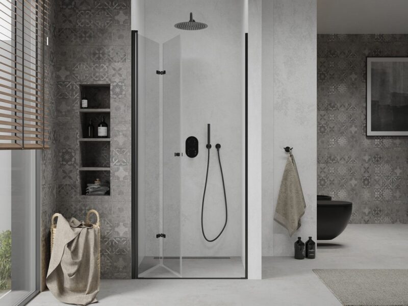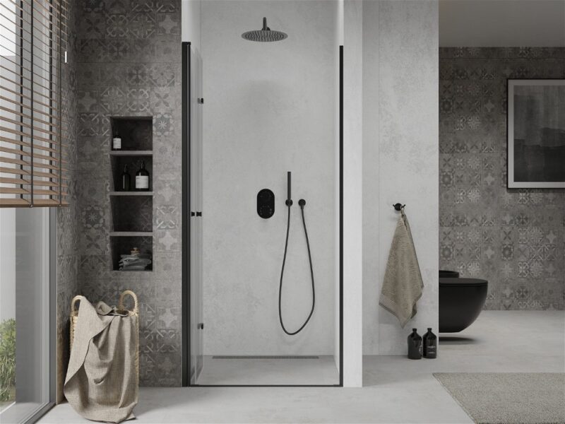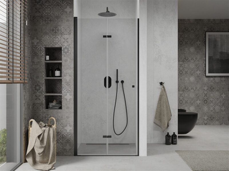 MEXEN – LIMA skladacie dvere 90×190 cm 6mm, čierne, transparent so stenovým profilom 856-090-000-70-00