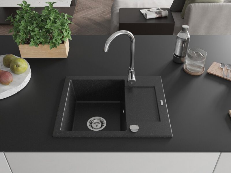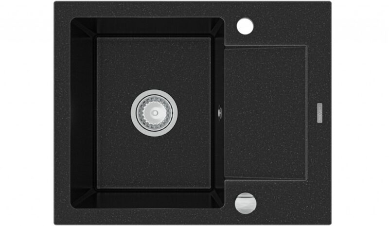 MEXEN MEXEN – Enzo granitový drez 1-misa drez s vypúšťaním krátky odkvapkávač 576×465 mm, čierna / strieborná metalíza 6506571005-73