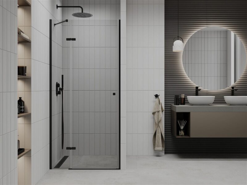 MEXEN – ROMA krídlové dvere 90×190 cm 6mm, čierne, transparent so stenovým profilom 854-090-000-70-00