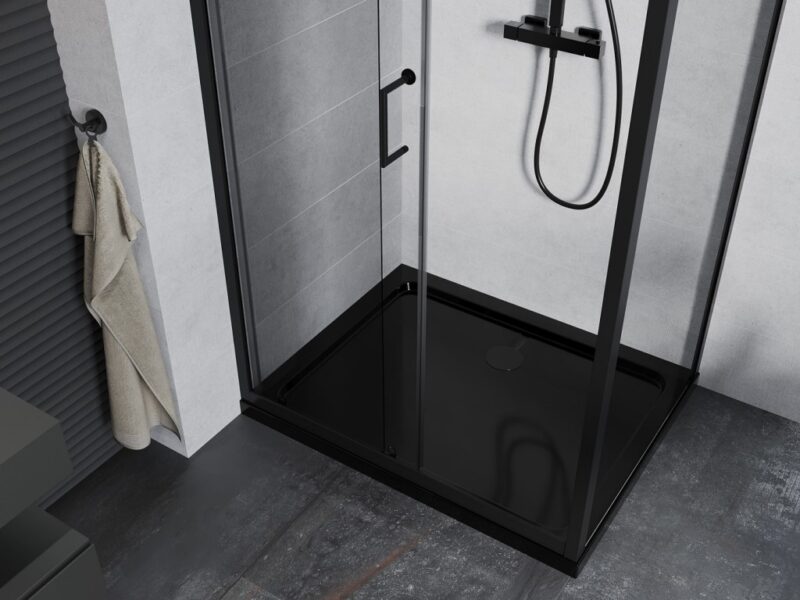 Technické údaje kabíny: Rozmer: 130×90 cm (dvere 130 cm, stena 90 cm) Výška: 190 cm Montáž: Univerzálna Vstup: Posuvné dvere Farba skla: Transparent – Transparent Povrchová úprava: čierna Typ skla: Tvrdené Hrúbka skla: 5 mm Profil: Hliník Ľahko čistiteľný povlak: Áno Vyrovnanie nerovností steny: Áno Nastavenie šírky: Áno Možno inštalovať na sprchovú vaničku alebo dlaždice: Áno Kovová rukoväť Súprava tesnení na odvod vody Hliníkový prah tesniace dvere Technické dáta sprchovej vaničky: Rozmery: 130 x 90 x 5 cm Čierna farba Typ: Obdĺžnikový, Slim Materiál: sanitárny akryl Vystužené dno Kompletný so sifónom vyčisteným zhora Priemer odtoku: 90 mm Povrchová úprava korku: čierna(GT) Ean: 5907709153172