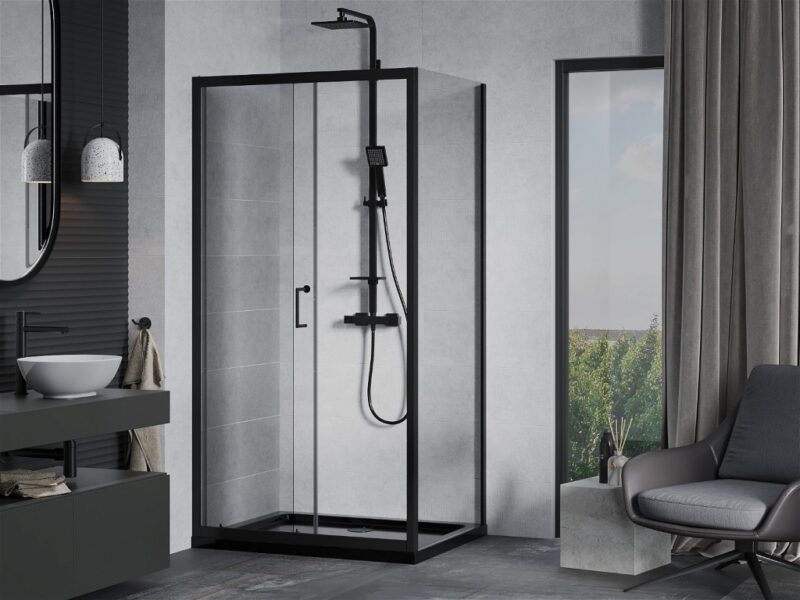 Technické údaje kabíny: Rozmer: 90×80 cm (dvere 90 cm, stena 80 cm) Výška: 190 cm Montáž: Univerzálna Vstup: Posuvné dvere Farba skla: Transparent – Transparent Povrchová úprava: čierna Typ skla: Tvrdené Hrúbka skla: 5 mm Profil: Hliník Ľahko čistiteľný povlak: Áno Vyrovnanie nerovností steny: Áno Nastavenie šírky: Áno Možno inštalovať na sprchovú vaničku alebo dlaždice: Áno Kovová rukoväť Súprava tesnení na odvod vody Hliníkový prah tesniace dvere Technické dáta sprchovej vaničky: Rozmer: 90 x 80 x 5 cm Čierna farba Typ: Obdĺžnikový, Slim Materiál: sanitárny akryl Vystužené dno Kompletný so sifónom vyčisteným zhora Priemer odtoku: 90 mm Povrchová úprava korku: čierna(GT) Ean: 5907709153004