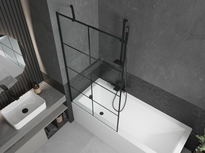 MEXEN/S – Cubik obdĺžniková vaňa 150 x 70 cm s panelom + vaňová zástena 90, čierna vzor 550315070X9509007077