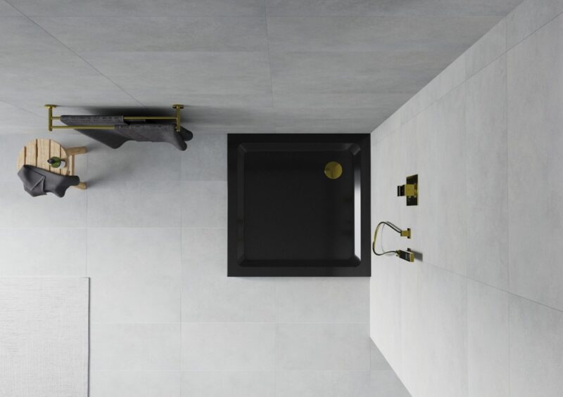 MEXEN/S – Flat sprchová vanička štvorcová slim 70 x 70, čierna + zlatý sifón 40707070G