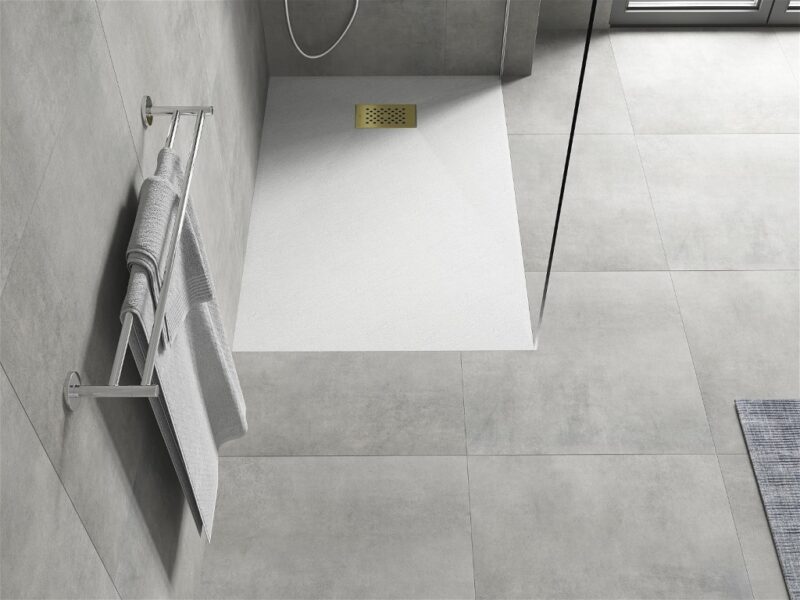 Technické dáta: Rozmer: 100x80x2, 6 cm biela farba Typ: Obdĺžnikový, Ultra plochý Inštalácia: Do podlahy alebo na podlahu Materiál: SMC – plast Kamenná štruktúra Možnosť rezania sprchovej vaničky Odolný výrobok, ktorý sa nedeformuje Maximálna stabilita vďaka dobrej odolnosti proti nárazu Sada obsahuje sifón, ktorý sa čistí zhora Priemer odtoku: 90 mm Povrchová úprava mriežky: zlatá(GT) Ean: 5905315224941