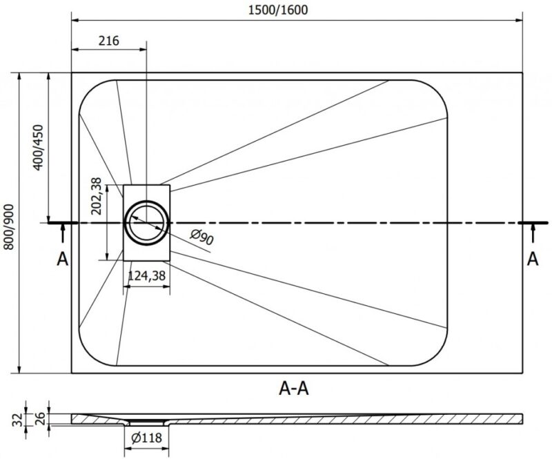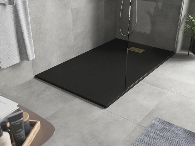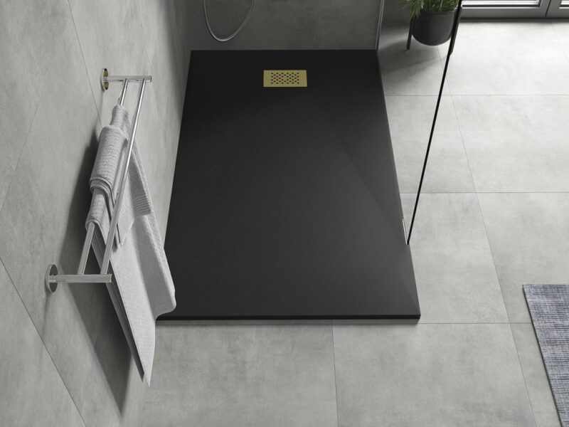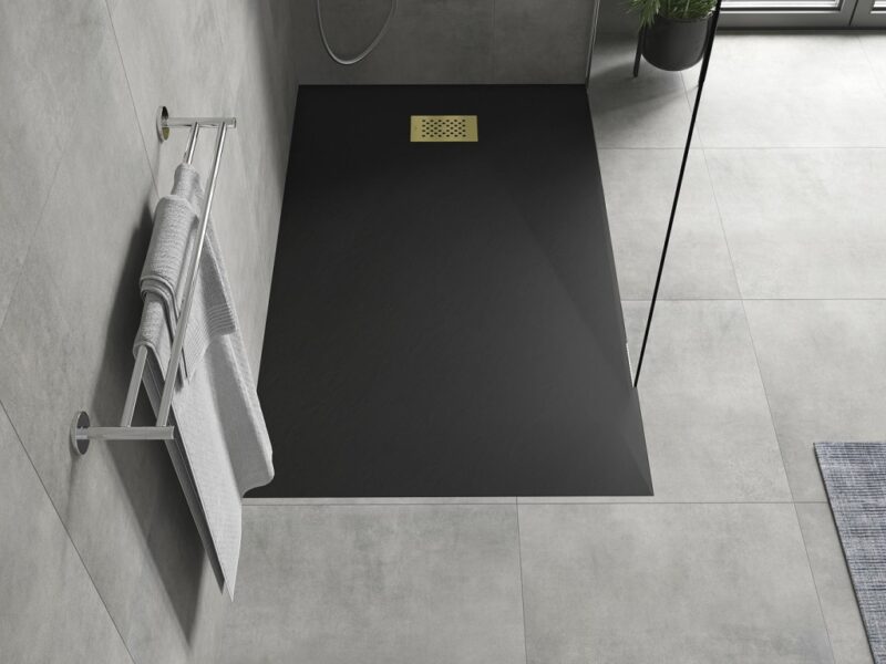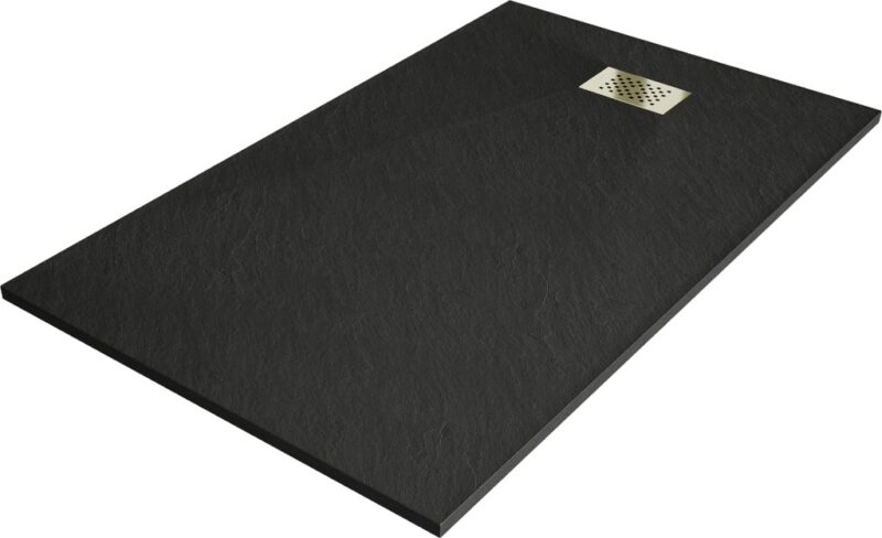 Technické dáta: Rozmer: 160x90x2, 6 cm Čierna farba Typ: Obdĺžnikový, Ultra plochý Inštalácia: Do podlahy alebo na podlahu Materiál: SMC – plast Kamenná štruktúra Možnosť rezania sprchovej vaničky Odolný výrobok, ktorý sa nedeformuje Maximálna stabilita vďaka dobrej odolnosti proti nárazu Sada obsahuje sifón, ktorý sa čistí zhora Priemer odtoku: 90 mm Povrchová úprava mriežky: zlatá(GT) Ean: 5905315226303