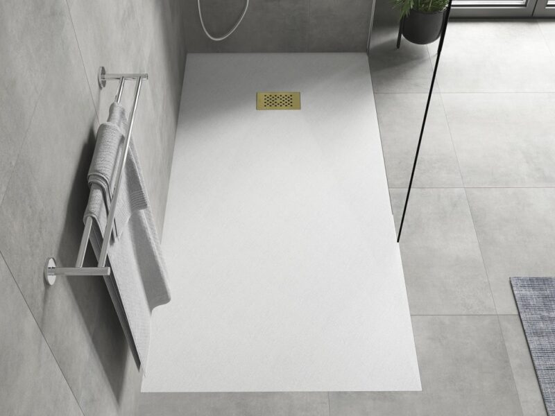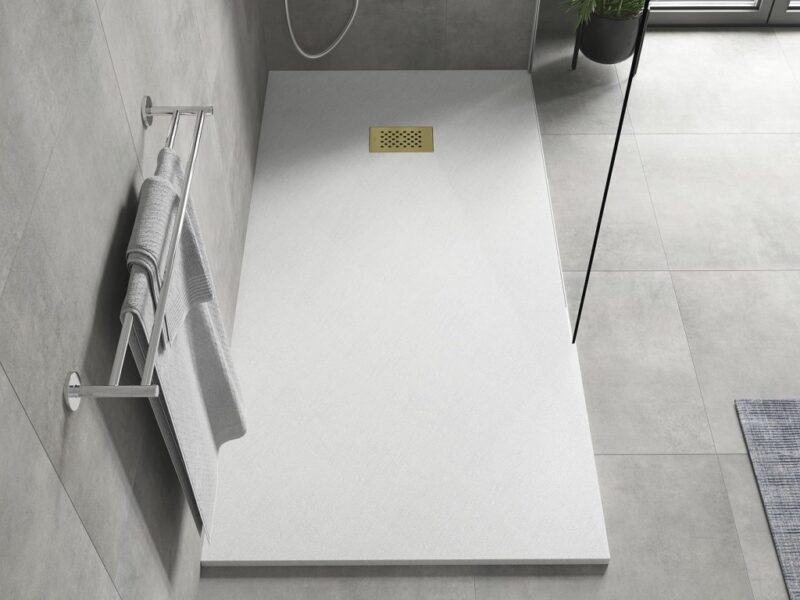 Technické dáta: Rozmer: 170x80x2, 6 cm biela farba Typ: Obdĺžnikový, Ultra plochý Inštalácia: Do podlahy alebo na podlahu Materiál: SMC – plast Kamenná štruktúra Možnosť rezania sprchovej vaničky Odolný produkt, ktorý sa nedeformuje Maximálna stabilita vďaka dobrej odolnosti proti nárazu Sada obsahuje sifón, ktorý sa čistí zhora Priemer odtoku: 90 mm Povrchová úprava mriežky: zlatá(GT) Ean: 5905315225016