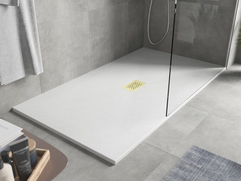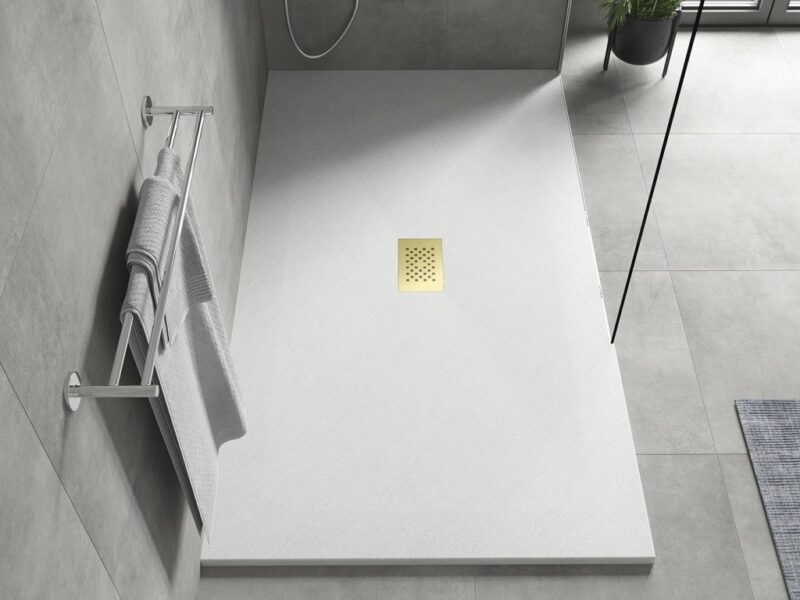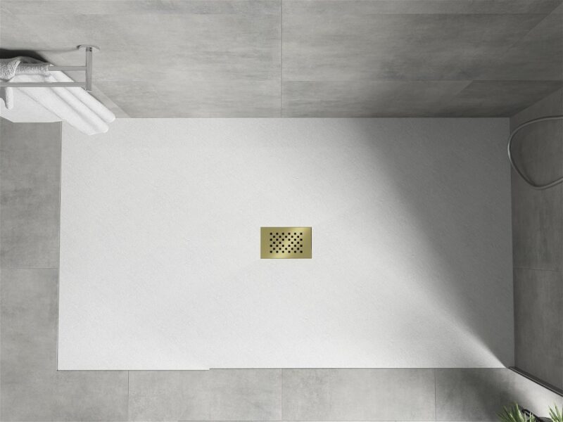 Technické dáta: Rozmer: 170x100x2, 6 cm biela farba Typ: Obdĺžnikový, Ultra plochý Inštalácia: Do podlahy alebo na podlahu Materiál: SMC – plast Kamenná štruktúra Možnosť rezania sprchovej vaničky Odolný produkt, ktorý sa nedeformuje Maximálna stabilita vďaka dobrej odolnosti proti nárazu Sada obsahuje sifón, ktorý sa čistí zhora Priemer odtoku: 90 mm Povrchová úprava mriežky: zlatá(GT) Ean: 5905315225214