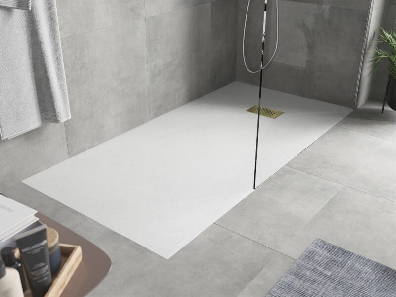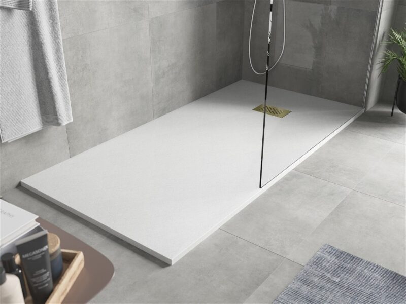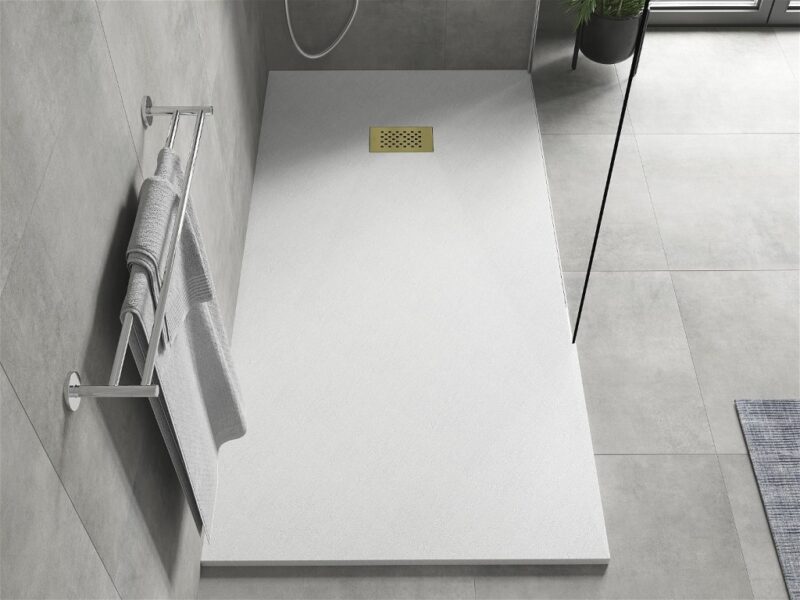 Technické dáta: Rozmer: 180x80x2, 6 cm biela farba Typ: Obdĺžnikový, Ultra plochý Inštalácia: Do podlahy alebo na podlahu Materiál: SMC – plast Kamenná štruktúra Možnosť rezania sprchovej vaničky Odolný výrobok, ktorý sa nedeformuje Maximálna stabilita vďaka dobrej odolnosti proti nárazu Sada obsahuje sifón, ktorý sa čistí zhora Priemer odtoku: 90 mm Povrchová úprava mriežky: zlatá(GT) Ean: 5905315225023