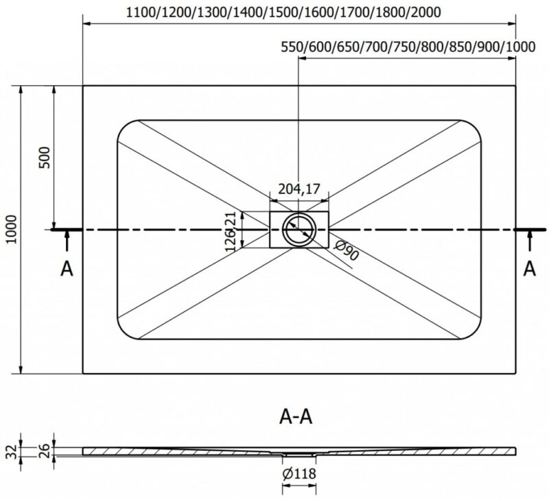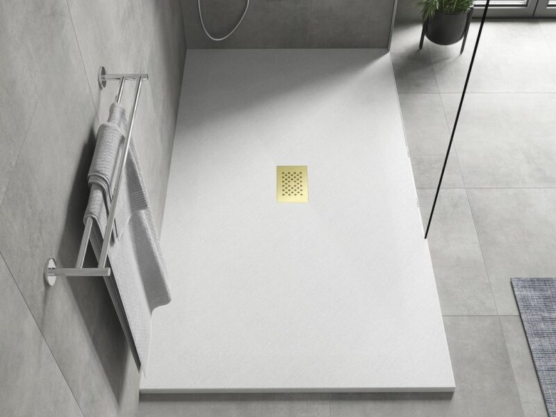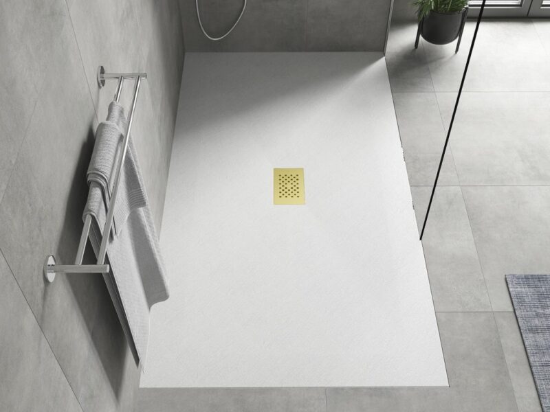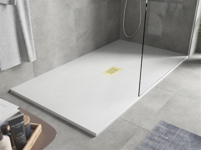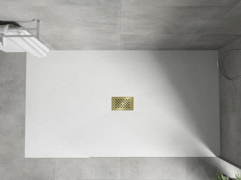 Technické dáta: Rozmer: 200x100x2, 6 cm biela farba Typ: Obdĺžnikový, Ultra plochý Inštalácia: Do podlahy alebo na podlahu Materiál: SMC – plast Kamenná štruktúra Možnosť rezania sprchovej vaničky Odolný výrobok, ktorý sa nedeformuje Maximálna stabilita vďaka dobrej odolnosti proti nárazu Sada obsahuje sifón, ktorý sa čistí zhora Priemer odtoku: 90 mm Povrchová úprava mriežky: zlatá(GT) Ean: 5905315225221