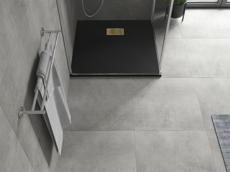 Technické dáta: Rozmer: 80x80x2, 6 cm Čierna farba Typ: štvorcový, ultra plochý Inštalácia: Do podlahy alebo na podlahu Materiál: SMC – plast Kamenná štruktúra Možnosť rezania sprchovej vaničky Odolný produkt, ktorý sa nedeformuje Maximálna stabilita vďaka dobrej odolnosti proti nárazu Sada obsahuje sifón, ktorý sa čistí zhora Priemer odtoku: 90 mm Povrchová úprava mriežky: zlatá(GT) Ean: 5905315226129