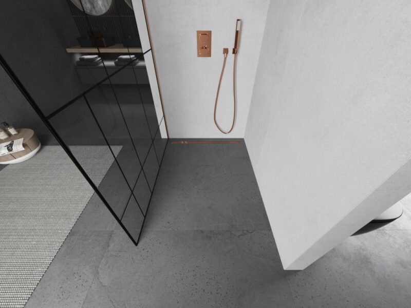 Špecifikácia produktu: Šírka: 110 cm Výška: 200 cm Inštalácia: Univerzálna, pravá alebo ľavá Farba skla: Čierny vzor Povrchová úprava: brúsená meď Typ skla: Tvrdené Hrúbka skla: 8 mm Profil: Hliník L-uhlový stabilizátor: Nerezová oceľ Obliečka na jednoduché čistenie Vyrovnanie nerovností steny Možno namontovať na sprchovú vaničku alebo dlaždice(GT) Ean: 5905315255822