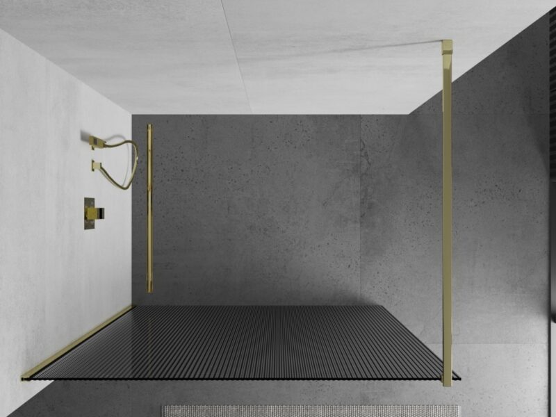 Technické dáta: Šírka: 100 cm Výška: 200 cm Montáž: Univerzálna, pravá alebo ľavá Farba skla: pruhovaná Povrchová úprava: zlatá Typ skla: Tvrdené Hrúbka skla: 8mm Profil: Hliník Držiak: Nerezová oceľ dĺžka max. držiak: 150 cm Držiak je možné orezať Ľahko čistiteľný povlak Vyrovnanie nerovností steny Možno inštalovať na sprchovú vaničku alebo dlaždice(GT) Ean: 5905315200198