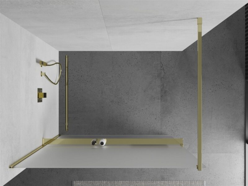 MEXEN/S – KIOTO Sprchová zástena WALK-IN s poličkou a držiakom uterákov 100 x 200, matné sklo 8 mm, zlatá 800-100-121-50-30