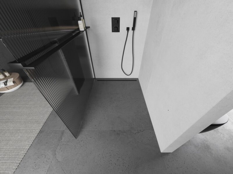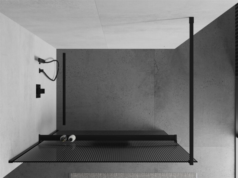 Technické dáta: Šírka: 100 cm Výška: 200 cm Montáž: Univerzálna, pravá alebo ľavá Farba skla: pruhovaná Povrchová úprava: čierna Typ skla: Tvrdené Hrúbka skla: 8mm Profil: Hliník Držiak: Nerezová oceľ dĺžka max. držiak: 150 cm Materiál police: hliník Šírka: 12,9 cm Výška: 3,2 cm dĺžka max. police: 140 cm Možnosť rezania držiaka a police Ľahko čistiteľný povlak Vyrovnanie nerovností steny Možno inštalovať na sprchovú vaničku alebo dlaždice(GT) Ean: 5905315201201