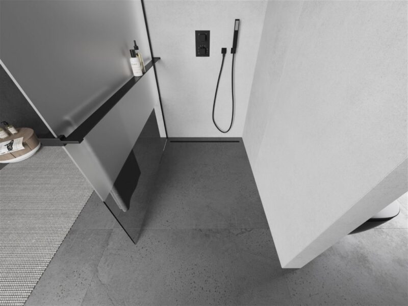 MEXEN/S – KIOTO Sprchová zástena WALK-IN s poličkou a držiakom uterákov 100 x 200, transparent/matné sklo 8 mm, čierna 800-100-121-70-35