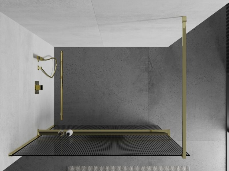 MEXEN/S – Kioto+ Sprchová zástena WALK-IN s poličkou a držiakom uterákov 110 x 200, prúžky 8 mm, zlatá 800-110-121-50-09