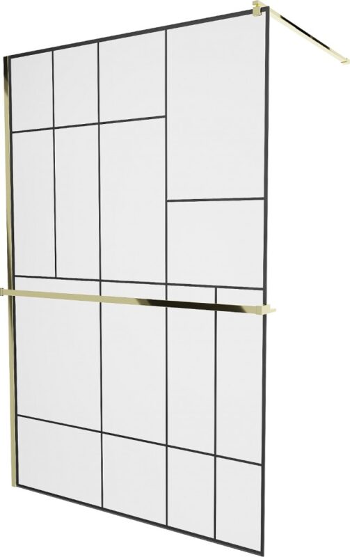 MEXEN/S – KIOTO Sprchová zástena WALK-IN s poličkou a držiakom uterákov 110 x 200, transparent/čierna 8 mm, zlatá 800-110-121-50-78