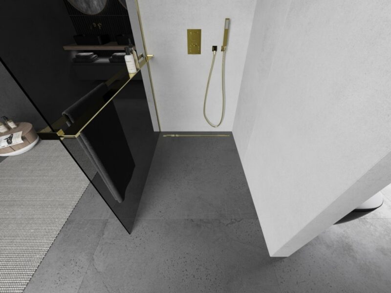 MEXEN/S – KIOTO Sprchová zástena WALK-IN s poličkou a držiakom uterákov 120 x 200, grafit 8 mm, zlatá 800-120-121-50-40