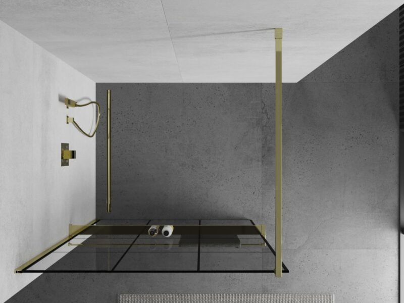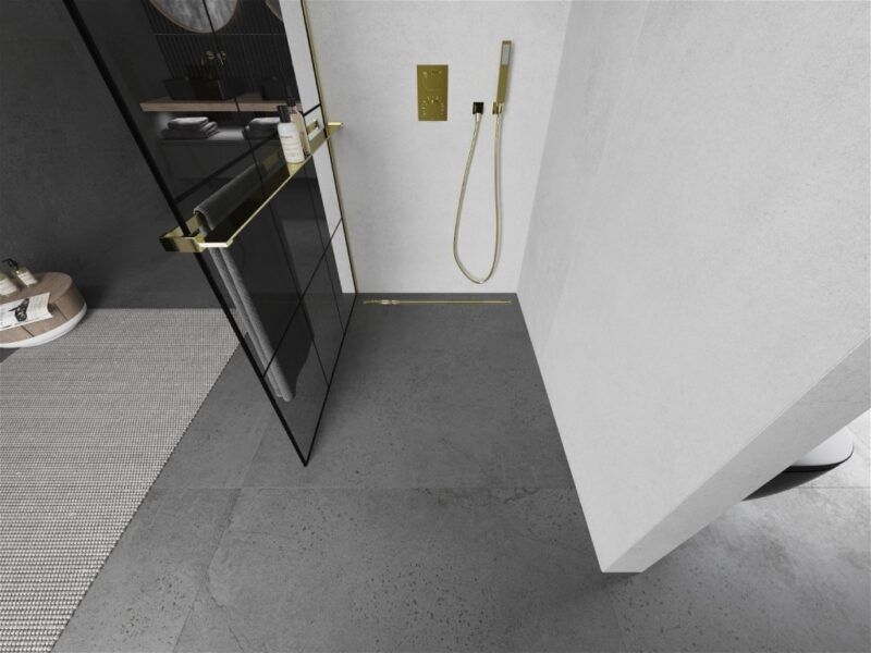 MEXEN/S – KIOTO Sprchová zástena WALK-IN s poličkou a držiakom uterákov 120 x 200, transparent/čierna 8 mm, zlatá 800-120-121-50-77