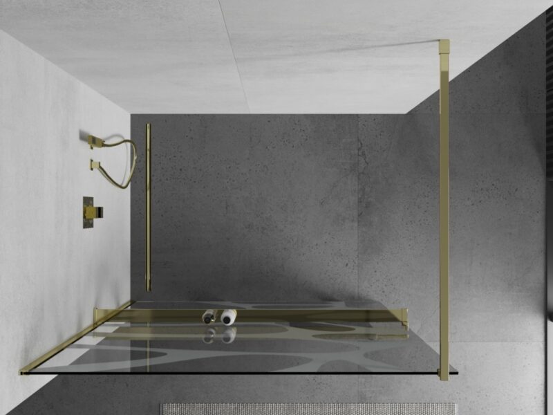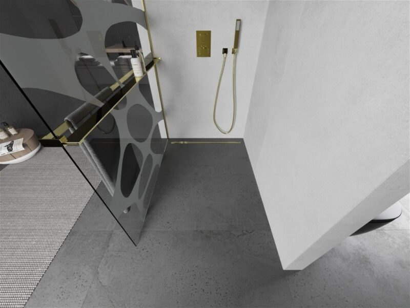 MEXEN/S – KIOTO Sprchová zástena WALK-IN s poličkou a držiakom uterákov 70 x 200, transparent/bialy vzór 8 mm, zlatá 800-070-121-50-97