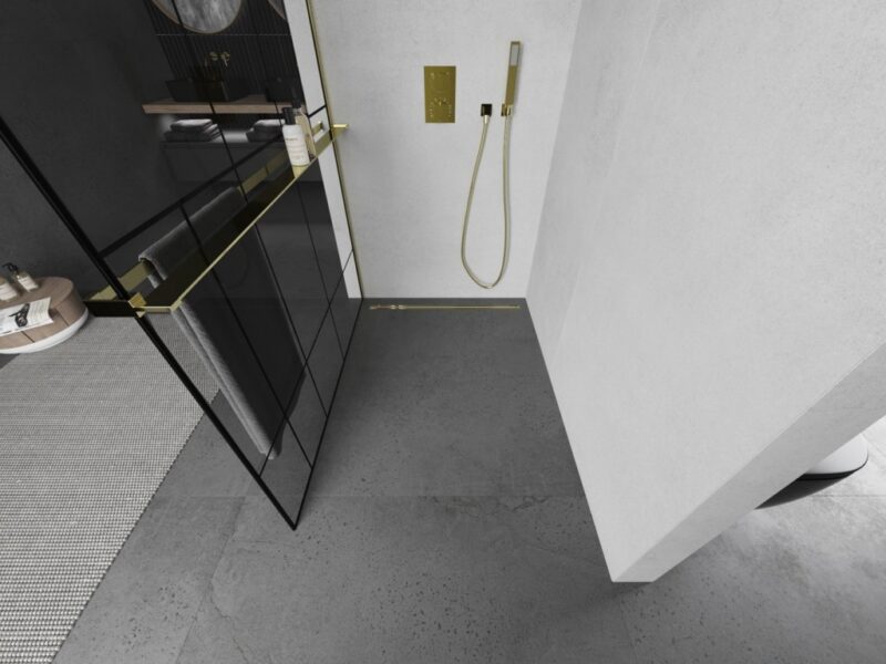 MEXEN/S – KIOTO Sprchová zástena WALK-IN s poličkou a držiakom uterákov 70 x 200, transparent/čierna 8 mm, zlatá 800-070-121-50-78