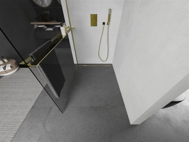 MEXEN/S – KIOTO Sprchová zástena WALK-IN s poličkou a držiakom uterákov 80 x 200, transparent 8 mm, zlatá 800-080-121-50-00