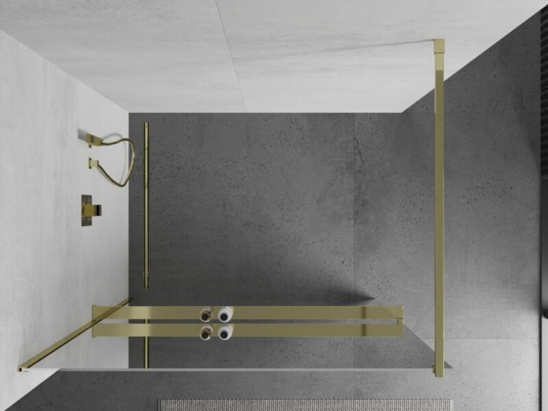 MEXEN/S – KIOTO Sprchová zástena WALK-IN s poličkou a držiakom uterákov 90 x 200, zrkadlové 8 mm, zlatá 800-090-121-50-50