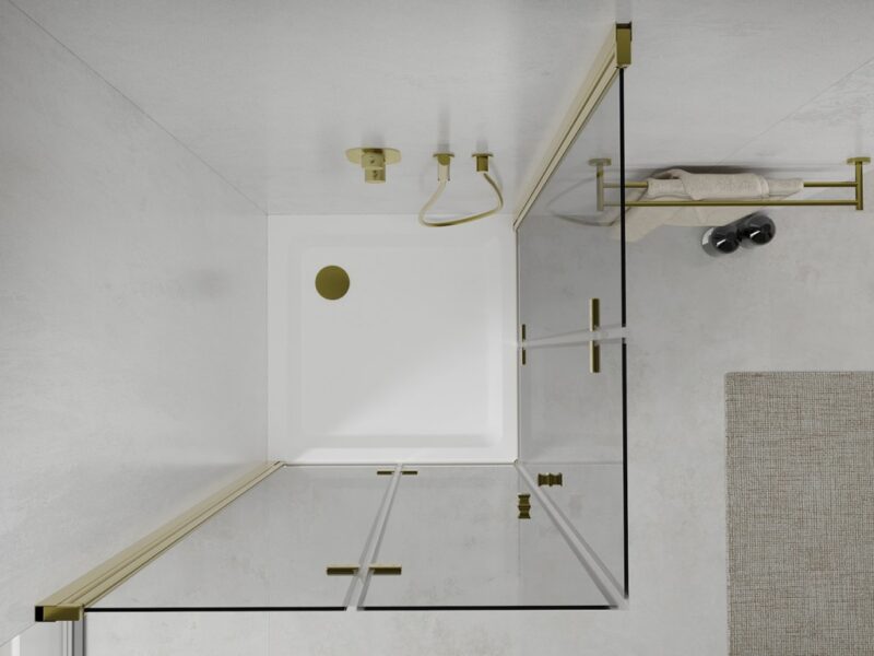 Technické údaje kabíny: Rozmer: 100×100 cm Výška: 190 cm Montáž: Univerzálna Vstup: otočné dvere Farba skla: Transparent – Transparent Povrchová úprava: zlatá Typ skla: Tvrdené Hrúbka skla: 6 mm Profil: Hliník Obliečka na jednoduché čistenie: Áno Vyrovnanie nerovností steny: Áno Nastavenie šírky: Áno Možné namontovať na bazény alebo dlaždice: Áno Kovová rukoväť Súprava tesnení na odvod vody Hliníkový prah dverí Technické údaje sprchovej vaničky: Rozmer: 100x100x5 cm biela farba Typ: štvorcový, tenký Materiál: Sanitárny akryl Vystužené dno Kompletný so sifónom vyčisteným zhora Priemer odtoku: 90 mm Povrchová úprava korku: zlatá(GT) Ean: 5907709165243