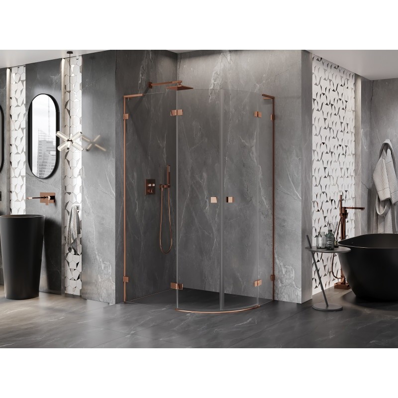 Špecifikácia produktu: Rozmer: 100×80 cm (ľavé dvere 100 cm, pravé dvere 80 cm) Výška: 200 cm Polomer zaoblenia R55 Strana montáže: Ľavá Vchod: Krídlové dvere Farba skla: Priehľadná Povrchová úprava: Ružové zlato Profil: Hliník L-uhlový stabilizátor: nerezová oceľ Typ skla: Tvrdené Hrúbka skla: 8 mm Ľahko čistiteľný povlak Možnosť nastavenia šírky Dva montážne systémy: – S profilom, ktorý umožňuje vyrovnanie nerovností stien – Bez profilu pre dokonale rovné steny Možno namontovať na sprchovú vaničku alebo dlaždice Mechanizmus zdvíhania a spúšťania dverí Mosadzné spony a pánty v jednej rovine so sklenenou tabuľou Magnetický prúžok a elastomérové tesnenia na odvod vody Hliníkový prah na tesnenie dverí(GT) Ean: 5905315412676