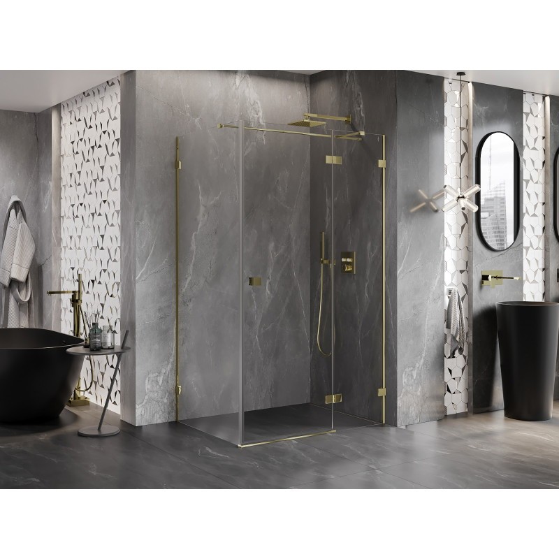 Špecifikácia produktu: Rozmer: 135×120 cm (pravé dvere 135 cm, stena 120 cm) Výška: 200 cm Montážna strana: Pravá Vstup: krídlové dvere Farba skla: Transparentný Povrchová úprava: zlatá Profil: Hliník Držiak: Nerezová oceľ Dĺžka max. držiak: 150 cm Typ skla: Tvrdené Hrúbka skla: 8 mm Ľahko čistiteľný povlak Možnosť nastavenia šírky Dva montážne systémy: – S profilom, ktorý umožňuje vyrovnanie nerovností stien – Žiadny profil pre dokonale rovné steny Možno namontovať na sprchovú vaničku alebo dlaždice Mechanizmus zdvíhania a spúšťania dverí Mosadzné spony a pánty lícujú so sklenenou tabuľou Magnetický prúžok a elastomérové tesnenie pre odvod vody Hliníkový tesniaci prah dverí(GT) Ean: 5905315448187