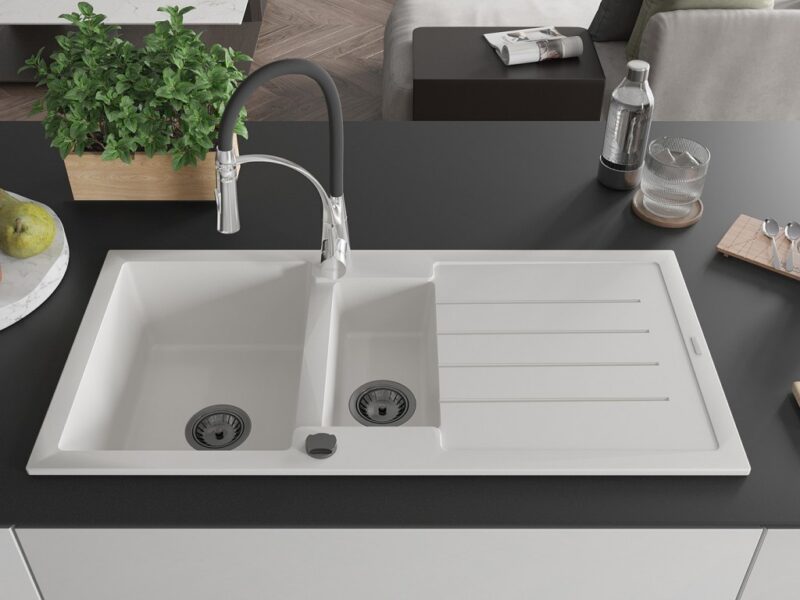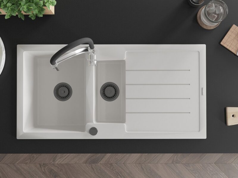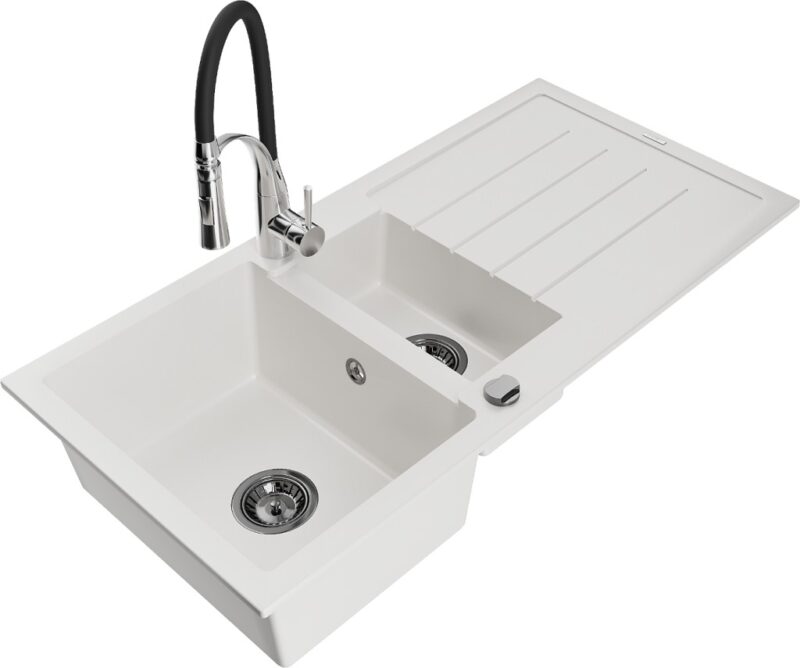 Technické údaje: Kuchynský drez: Rozmer: 1000x500x200 mm Hĺbka komory: 190 mm (väčšia), 115 mm (menšia) Rozmery komory: 430×330 mm (väčšie), 340×170 mm (menšie) Priemer odtoku: ø90 mm Typ: 1,5-miska s odkvapkávačom Typ: Zapustené do pracovnej dosky Farba: Biela Povrchová úprava sifónu: čierna Materiál: žula (80% žulové kamenivo 20% živice) Prepadový otvor: Áno Otvory: (batérie, automat) 2 Inštalácia: Univerzálna, je možné inštalovať s odkvapkávačom na ľavú alebo pravú stranu Vysoká odolnosť proti poškriabaniu a zmene farby Odolnosť proti tepelným šokom Povrch pre ľahké čistenie Dva dodatočné vyfrézované otvory na samodierovanie ø35 Kuchynská batéria: Materiál: mosadz Farba: chróm/čierna Hlava: Keramická Perlátor: Áno Typ výtoku: Flexibilný s mosadzným držiakom Typ: Jednopákové Výška batérie: 430 mm Rozsah výtoku: 235 mm(GT) Ean: 5905315047571