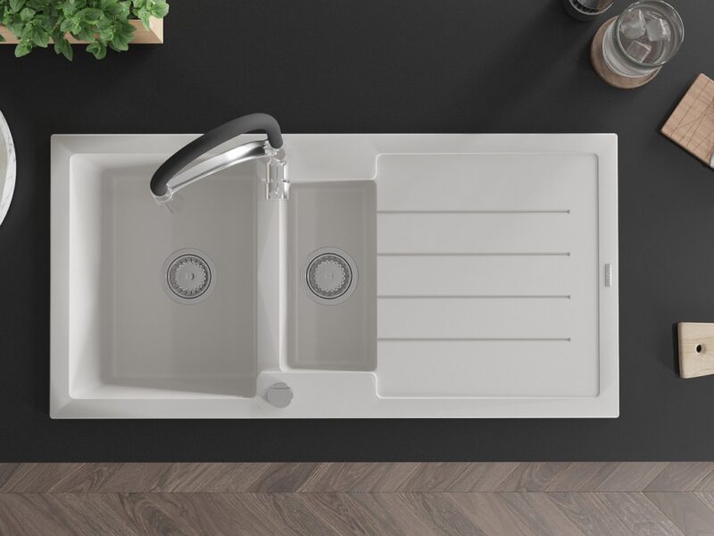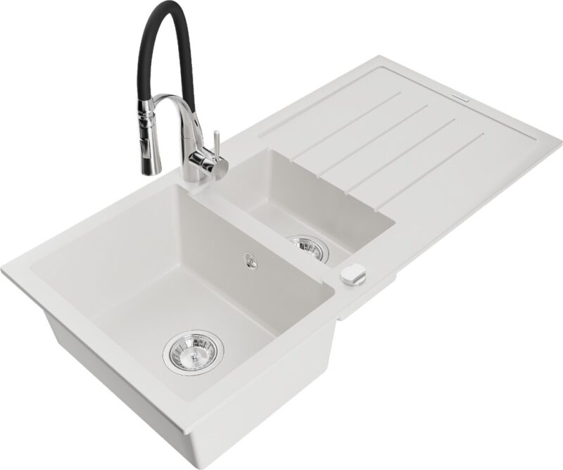 Technické údaje: Kuchynský drez: Rozmer: 1000x500x200 mm Hĺbka komory: 190 mm (väčšia), 115 mm (menšia) Rozmery komory: 430×330 mm (väčšie), 340×170 mm (menšie) Priemer odtoku: ø90 mm Typ: 1,5-miska s odkvapkávačom Typ: Zapustené do pracovnej dosky Farba: Biela Povrchová úprava sifónu: Chrome Materiál: žula (80% žulové kamenivo 20% živice) Prepadový otvor: Áno Otvory: (batérie, automat) 2 Inštalácia: Univerzálna, je možné inštalovať s odkvapkávačom na ľavú alebo pravú stranu Vysoká odolnosť proti poškriabaniu a zmene farby Odolnosť proti tepelným šokom Povrch pre ľahké čistenie Dva dodatočné vyfrézované otvory na samodierovanie ø35 Kuchynská batéria: Materiál: mosadz Farba: chróm/čierna Hlava: Keramická Perlátor: Áno Typ výtoku: Flexibilný s mosadzným držiakom Typ: Jednopáková Výška batérie: 430 mm Rozsah výtoku: 235 mm(GT) Ean: 5905315047564