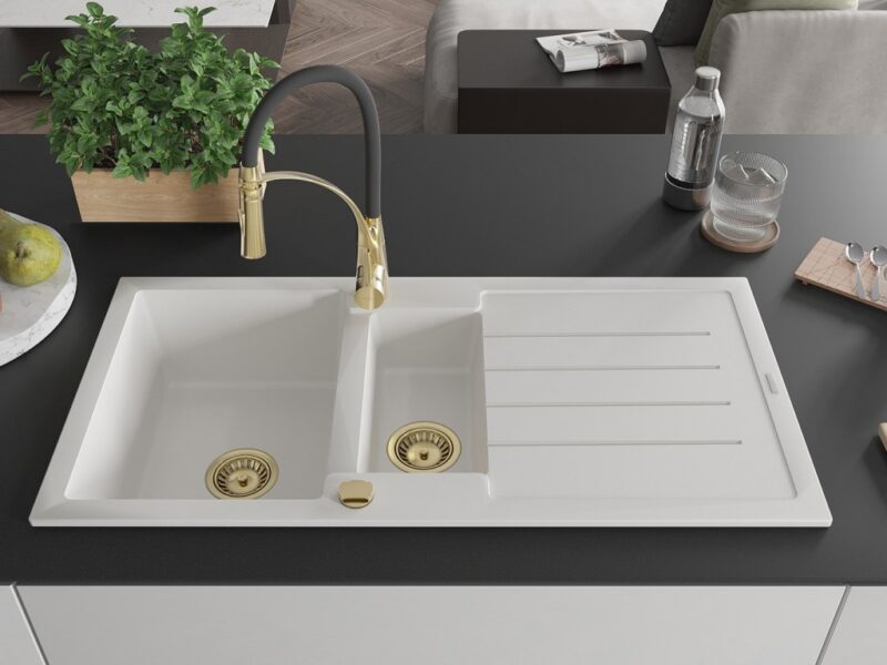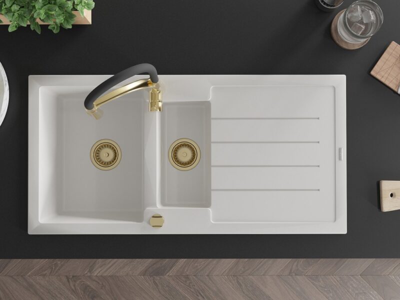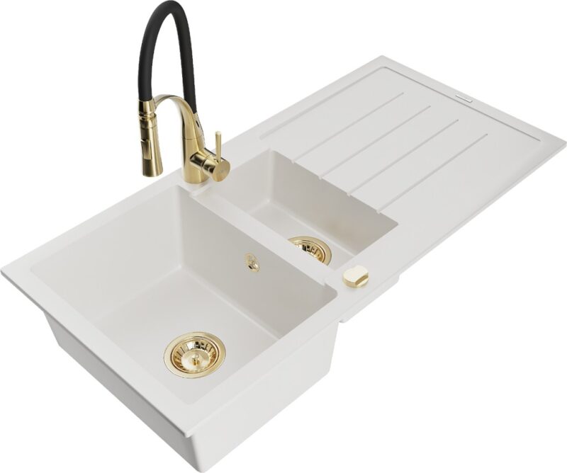 Technické údaje: Kuchynský drez: Rozmer: 1000x500x200 mm Hĺbka komory: 190 mm (väčšia), 115 mm (menšia) Rozmery komory: 430×330 mm (väčšie), 340×170 mm (menšie) Priemer odtoku: ø90 mm Typ: 1,5-miska s odkvapkávačom Typ: Zapustené do pracovnej dosky Farba: Biela Povrchová úprava sifónu: zlatá Materiál: žula (80% žulové kamenivo 20% živice) Prepadový otvor: Áno Otvory: (batérie, automat) 2 Inštalácia: Univerzálna, je možné inštalovať s odkvapkávačom na ľavú alebo pravú stranu Vysoká odolnosť proti poškriabaniu a zmene farby Odolnosť proti tepelným šokom Povrch pre ľahké čistenie Dva dodatočné vyfrézované otvory na samodierovanie ø35 Kuchynská batéria: Materiál: mosadz Farba: Zlatá/Čierna Hlava: Keramická Perlátor: Áno Typ výtoku: Flexibilný s mosadzným držiakom Typ: Jednopákové Výška batérie: 430 mm Rozsah výtoku: 235 mm(GT) Ean: 5905315047588
