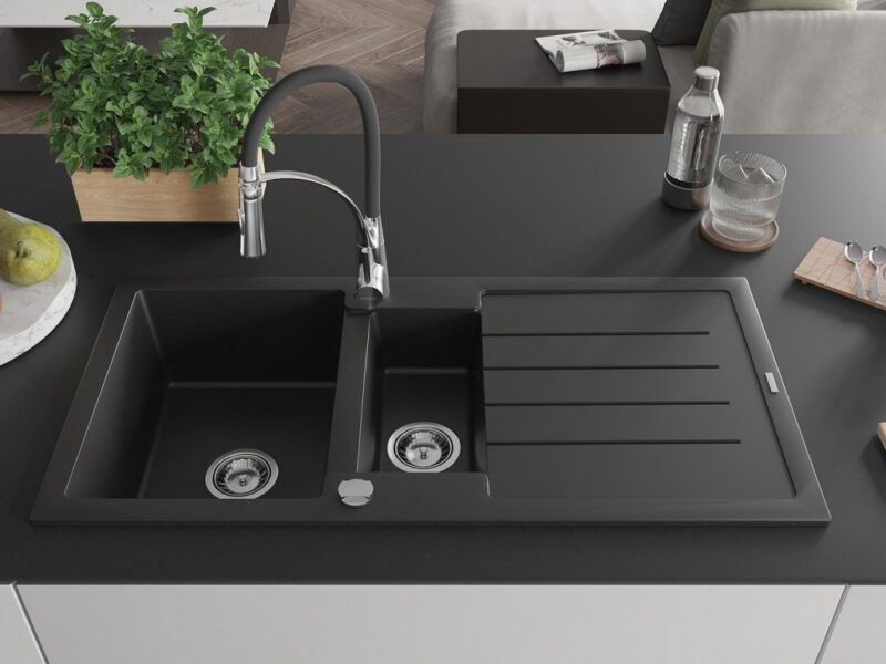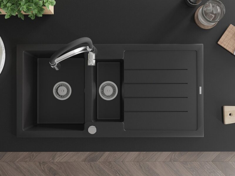 Technické dáta: Drez: Rozmer: 1000x500x200 mm Hĺbka komory: 190 mm (väčšia), 115 mm (menšia) Rozmery komory: 430×330 mm (väčšie), 340×170 mm (menšie) Priemer odtoku: ø90 mm Typ: 1,5-miska s odkvapkávačom Typ: Zapustené do pracovnej dosky Čierna farba Povrchová úprava sifónu: Chrome Materiál: žula (80% žulové kamenivo 20% živice) Prepadový otvor: Áno Otvory: (batérie, automat) 2 Inštalácia: Univerzálna, je možné inštalovať s odkvapkávačom na ľavú alebo pravú stranu Vysoká odolnosť proti poškriabaniu a zmene farby Odolnosť proti tepelným šokom Povrch pre ľahké čistenie Dva dodatočné vyfrézované otvory na samodierovanie ø35 Kuchynská batéria: Materiál: mosadz Farba: chróm/čierna Hlava: Keramická Perlátor: Áno Typ výtoku: Flexibilný s mosadznou podperou Typ: Jednopákové Výška batérie: 430 mm Rozsah výtoku: 235 mm(GT) Ean: 5905315047922