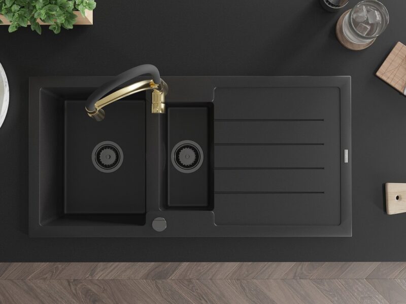 Technické dáta: Drez: Rozmer: 1000x500x200 mm Hĺbka komory: 190 mm (väčšia), 115 mm (menšia) Rozmery komory: 430×330 mm (väčšie), 340×170 mm (menšie) Priemer odtoku: ø90 mm Typ: 1,5-miska s odkvapkávačom Typ: Zapustené do pracovnej dosky Čierna farba Povrchová úprava sifónu: čierna Materiál: žula (80% žulové kamenivo 20% živice) Prepadový otvor: Áno Otvory: (batérie, automat) 2 Inštalácia: Univerzálna, je možné inštalovať s odkvapkávačom na ľavú alebo pravú stranu Vysoká odolnosť proti poškriabaniu a zmene farby Odolnosť proti tepelným šokom Povrch pre ľahké čistenie Dva dodatočné vyfrézované otvory na samodierovanie ø35 Kuchynská batéria: Materiál: mosadz Farba: Zlatá/Čierna Hlava: Keramická Perlátor: Áno Typ výtoku: Flexibilný s mosadzným držiakom Typ: Jednopákové Výška batérie: 430 mm Rozsah výtoku: 235 mm(GT) Ean: 5905315047953