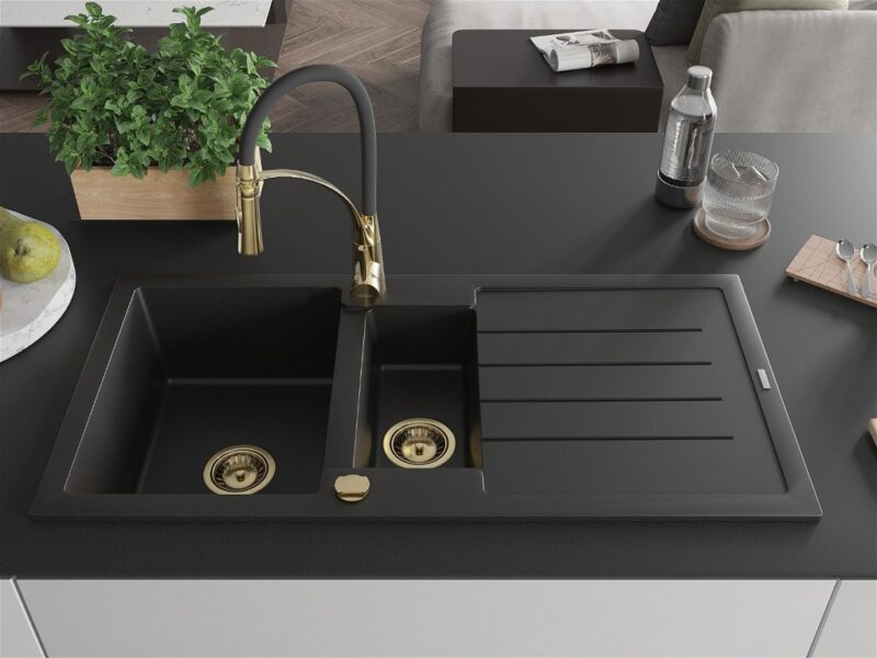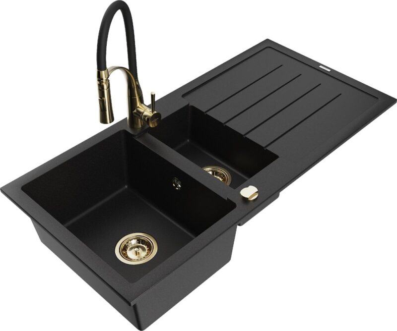 Technické dáta: Drez: Rozmer: 1000x500x200 mm Hĺbka komory: 190 mm (väčšia), 115 mm (menšia) Rozmery komory: 430×330 mm (väčšie), 340×170 mm (menšie) Priemer odtoku: ø90 mm Typ: 1,5-miska s odkvapkávačom Typ: Zapustené do pracovnej dosky Čierna farba Povrchová úprava sifónu: zlatá Materiál: žula (80% žulové kamenivo 20% živice) Prepadový otvor: Áno Otvory: (batérie, automat) 2 Inštalácia: Univerzálna, je možné inštalovať s odkvapkávačom na ľavú alebo pravú stranu Vysoká odolnosť proti poškriabaniu a zmene farby Odolnosť proti tepelným šokom Povrch pre ľahké čistenie Dva dodatočné vyfrézované otvory na samodierovanie ø35 Kuchynská batéria: Materiál: mosadz Farba: Zlatá/Čierna Hlava: Keramická Perlátor: Áno Typ výtoku: Flexibilný s mosadznou podperou Typ: Jednopákové Výška batérie: 430 mm Rozsah výtoku: 235 mm(GT) Ean: 5905315047946