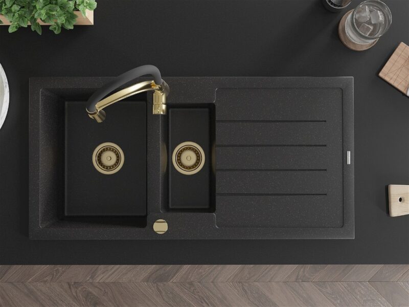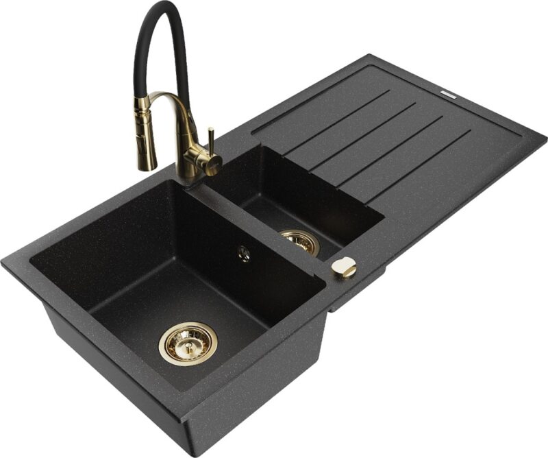 Technické dáta: Drez: Rozmer: 1000x500x200 mm Hĺbka komory: 190 mm (väčšia), 115 mm (menšia) Rozmery komory: 430×330 mm (väčšie), 340×170 mm (menšie) Priemer odtoku: ø90 mm Typ: 1,5-miska s odkvapkávačom Typ: Zapustené do pracovnej dosky Farba: čierna/strieborná metalíza Povrchová úprava sifónu: zlatá Materiál: žula (80% žulové kamenivo 20% živice) Prepadový otvor: Áno Otvory: (batérie, automat) 2 Inštalácia: Univerzálna, je možné inštalovať s odkvapkávačom na ľavú alebo pravú stranu Vysoká odolnosť proti poškriabaniu a zmene farby Odolnosť proti tepelným šokom Povrch pre ľahké čistenie Dva dodatočné vyfrézované otvory na samodierovanie ø35 Kuchynská batéria: Materiál: mosadz Farba: Zlatá/Čierna Hlava: Keramická Perlátor: Áno Typ výtoku: Flexibilný s mosadznou podperou Typ: Jednopákové Výška batérie: 430 mm Rozsah výtoku: 235 mm(GT) Ean: 5905315047762