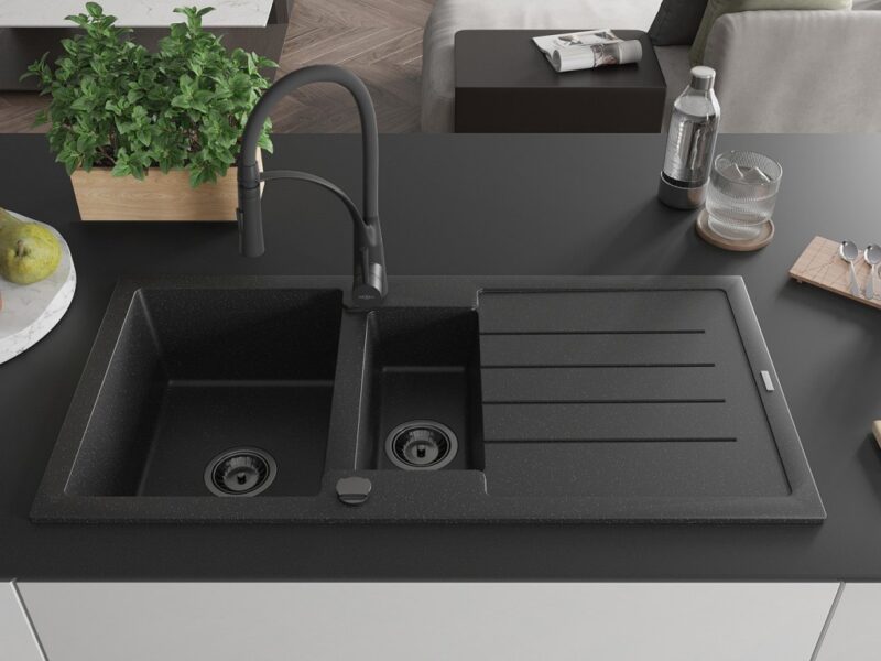 Technické dáta: Drez: Rozmer: 1000x500x200 mm Hĺbka komory: 190 mm (väčšia), 115 mm (menšia) Rozmery komory: 430×330 mm (väčšie), 340×170 mm (menšie) Priemer odtoku: ø90 mm Typ: 1,5-miska s odkvapkávačom Typ: Zapustené do pracovnej dosky Farba: čierna/strieborná metalíza Povrchová úprava sifónu: čierna Materiál: žula (80% žulové kamenivo 20% živice) Prepadový otvor: Áno Otvory: (batérie, automat) 2 Inštalácia: Univerzálna, je možné inštalovať s odkvapkávačom na ľavú alebo pravú stranu Vysoká odolnosť proti poškriabaniu a zmene farby Odolnosť proti tepelným šokom Povrch pre ľahké čistenie Dva dodatočné vyfrézované otvory na samodierovanie ø35 Kuchynská batéria: Materiál: mosadz Čierna farba Hlava: Keramická Perlátor: Áno Typ výtoku: Flexibilný s mosadznou podperou Typ: Jednopákové Výška batérie: 430 mm Rozsah výtoku: 235 mm(GT) Ean: 5905315047786