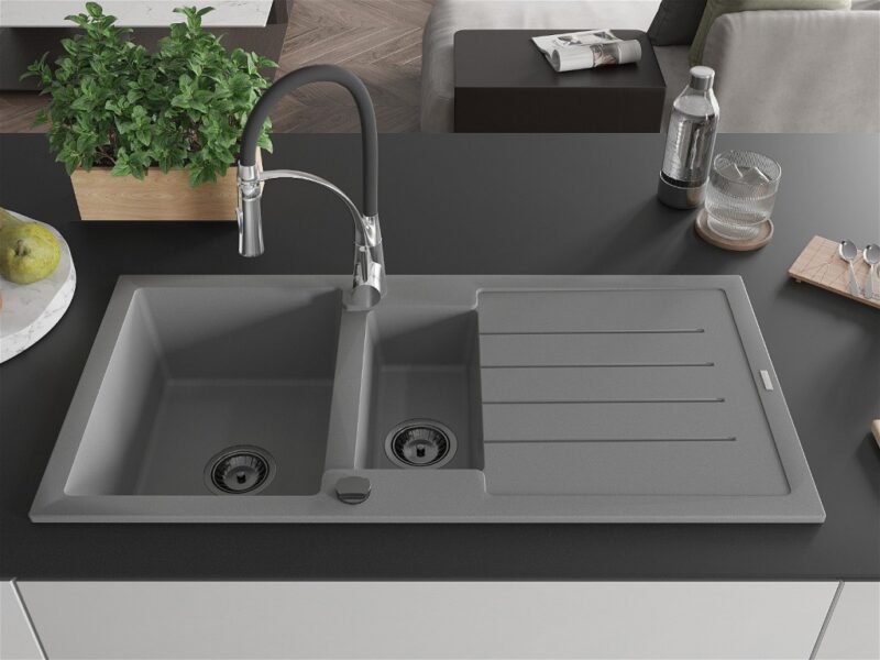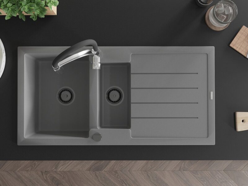 Technické dáta: Drez: Rozmer: 1000x500x200 mm Hĺbka komory: 190 mm (väčšia), 115 mm (menšia) Rozmery komory: 430×330 mm (väčšie), 340×170 mm (menšie) Priemer odtoku: ø90 mm Typ: 1,5-miska s odkvapkávačom Typ: Zapustené do pracovnej dosky Šedá farba Povrchová úprava sifónu: čierna Materiál: žula (80% žulové kamenivo 20% živice) Prepadový otvor: Áno Otvory: (batérie, automat) 2 Inštalácia: Univerzálna, je možné inštalovať s odkvapkávačom na ľavú alebo pravú stranu Vysoká odolnosť proti poškriabaniu a zmene farby Odolnosť proti tepelným šokom Povrch pre ľahké čistenie Dva dodatočné vyfrézované otvory na samodierovanie ø35 Kuchynská batéria: Materiál: mosadz Farba: chróm/čierna Hlava: Keramická Perlátor: Áno Typ výtoku: Flexibilný s mosadznou podperou Typ: Jednopákové Výška batérie: 430 mm Rozsah výtoku: 235 mm(GT) Ean: 5905315047694