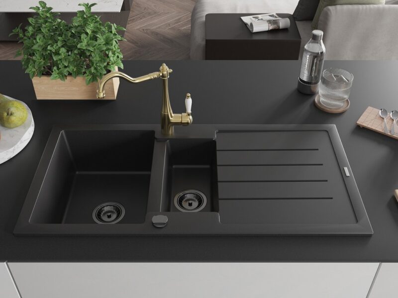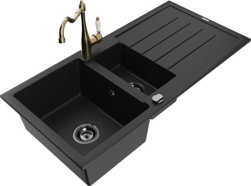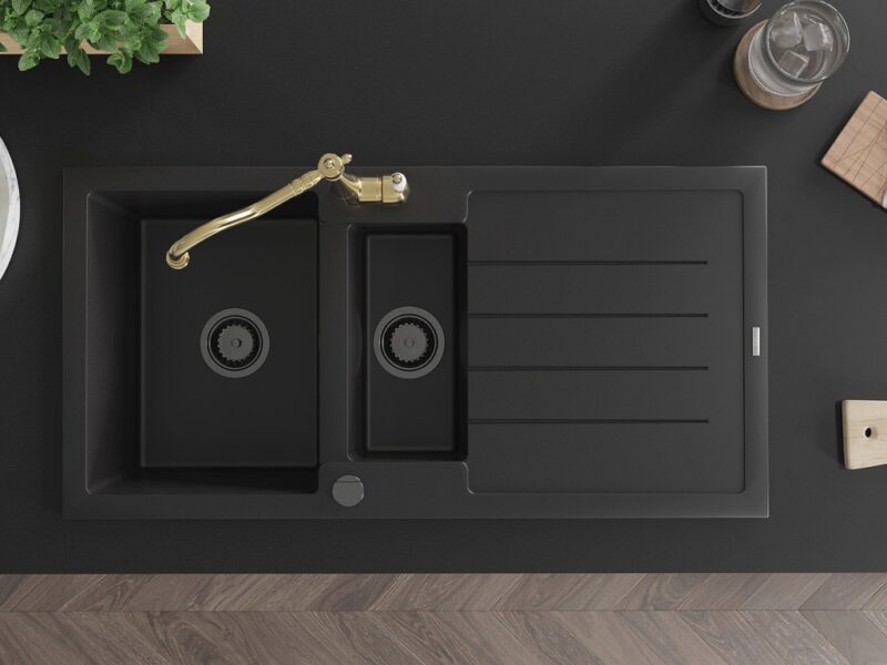 Drez: Rozmer: 1000x500x200 mm Hĺbka komory: 190 mm (väčšia), 115 mm (menšia) Rozmery komory: 430×330 mm (väčšie), 340×170 mm (menšie) Priemer odtoku: ø90 mm Typ: 1,5-miska s odkvapkávačom Typ: Zapustené do pracovnej dosky Čierna farba Povrchová úprava sifónu: čierna Materiál: žula (80% žulové kamenivo 20% živice) Prepadový otvor: Áno Otvory: (batérie, automat) 2 Inštalácia: Univerzálna, je možné inštalovať s odkvapkávačom na ľavú alebo pravú stranu Vysoká odolnosť proti poškriabaniu a zmene farby Odolnosť proti tepelným šokom Povrch pre ľahké čistenie Dva dodatočné vyfrézované otvory na samodierovanie ø35 Kuchynská batéria: Materiál: mosadz Farba: Zlatá Hlava: Keramická Perlátor: Áno Typ: Jednopáková Výška batérie: 290 mm Rozsah výtoku: 260 mm(GT) Ean: 5905315041517