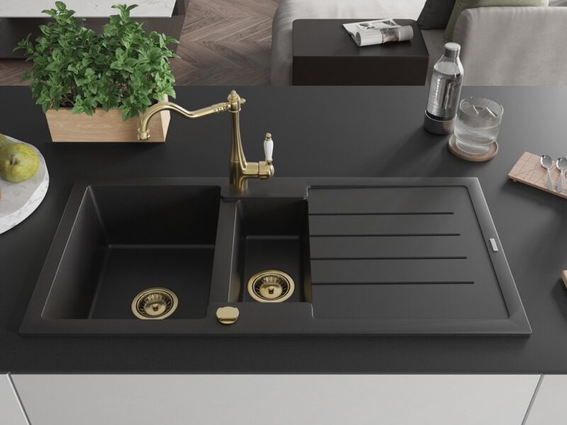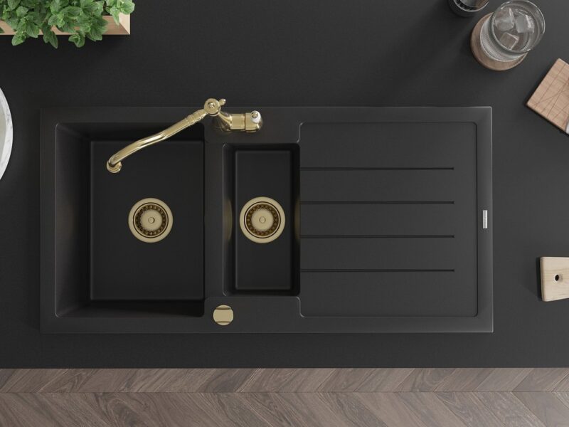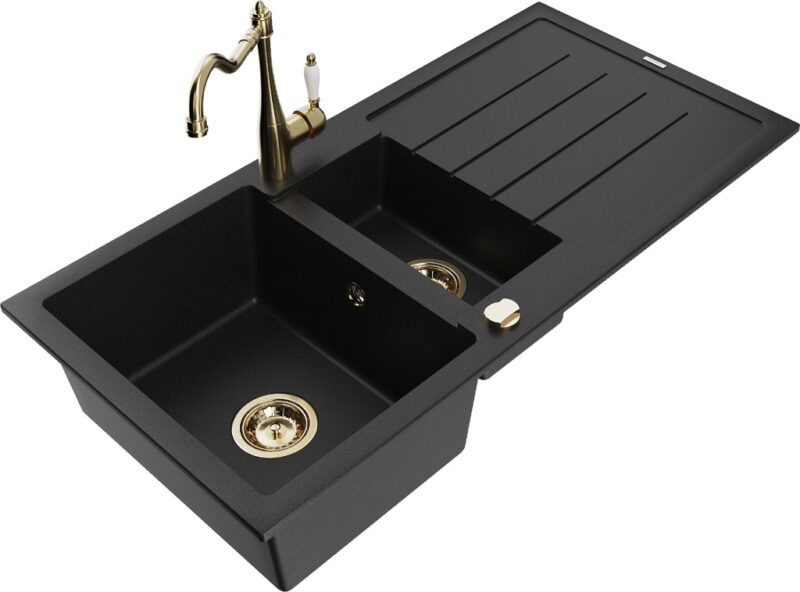 Drez: Rozmer: 1000x500x200 mm Hĺbka komory: 190 mm (väčšia), 115 mm (menšia) Rozmery komory: 430×330 mm (väčšie), 340×170 mm (menšie) Priemer odtoku: ø90 mm Typ: 1,5-miska s odkvapkávačom Typ: Zapustené do pracovnej dosky Čierna farba Povrchová úprava sifónu: zlatá Materiál: žula (80% žulové kamenivo 20% živice) Prepadový otvor: Áno Otvory: (batérie, automat) 2 Inštalácia: Univerzálna, je možné inštalovať s odkvapkávačom na ľavú alebo pravú stranu Vysoká odolnosť proti poškriabaniu a zmene farby Odolnosť proti tepelným šokom Povrch pre ľahké čistenie Dva dodatočné vyfrézované otvory na samodierovanie ø35 Kuchynská batéria: Materiál: mosadz Farba: Zlatá Hlava: Keramická Perlátor: Áno Typ: Jednopáková Výška batérie: 290 mm Rozsah výtoku: 260 mm(GT) Ean: 5905315041500