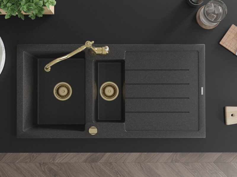 Drez: Rozmer: 1000x500x200 mm Hĺbka komory: 190 mm (väčšia), 115 mm (menšia) Rozmery komory: 430×330 mm (väčšie), 340×170 mm (menšie) Priemer odtoku: ø90 mm Typ: 1,5-miska s odkvapkávačom Typ: Zapustené do pracovnej dosky Farba: Škvrnitá čierna Povrchová úprava sifónu: zlatá Materiál: žula (80% žulové kamenivo 20% živice) Prepadový otvor: Áno Otvory: (batérie, automat) 2 Inštalácia: Univerzálna, je možné inštalovať s odkvapkávačom na ľavú alebo pravú stranu Vysoká odolnosť proti poškriabaniu a zmene farby Odolnosť proti tepelným šokom Povrch pre ľahké čistenie Dva dodatočné vyfrézované otvory na samodierovanie ø35 Kuchynská batéria: Materiál: mosadz Farba: Zlatá Hlava: Keramická Perlátor: Áno Typ: Jednopáková Výška batérie: 290 mm Rozsah výtoku: 260 mm(GT) Ean: 5905315041456