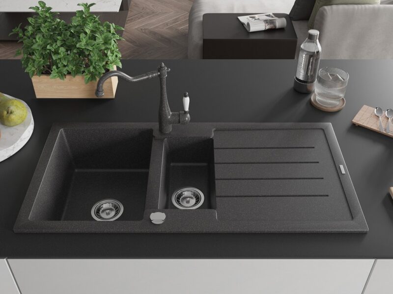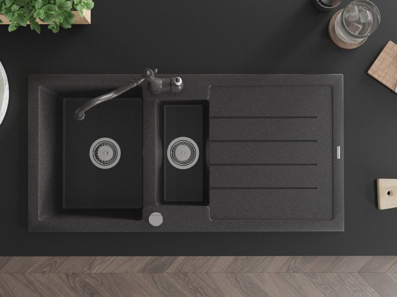 Drez: Rozmer: 1000x500x200 mm Hĺbka komory: 190 mm (väčšia), 115 mm (menšia) Rozmery komory: 430×330 mm (väčšie), 340×170 mm (menšie) Priemer odtoku: ø90 mm Typ: 1,5-miska s odkvapkávačom Typ: Zapustené do pracovnej dosky Farba: Škvrnitá čierna Povrchová úprava sifónu: Chrome Materiál: žula (80% žulové kamenivo 20% živice) Prepadový otvor: Áno Otvory: (batérie, automat) 2 Inštalácia: Univerzálna, je možné inštalovať s odkvapkávačom na ľavú alebo pravú stranu Vysoká odolnosť proti poškriabaniu a zmene farby Odolnosť proti tepelným šokom Povrch pre ľahké čistenie Dva dodatočné vyfrézované otvory na samodierovanie ø35 Kuchynská batéria: Materiál: mosadz Farba: Škvrnitá čierna Hlava: Keramická Perlátor: Áno Typ: Jednopáková Výška batérie: 290 mm Rozsah výtoku: 260 mm(GT) Ean: 5905315041487