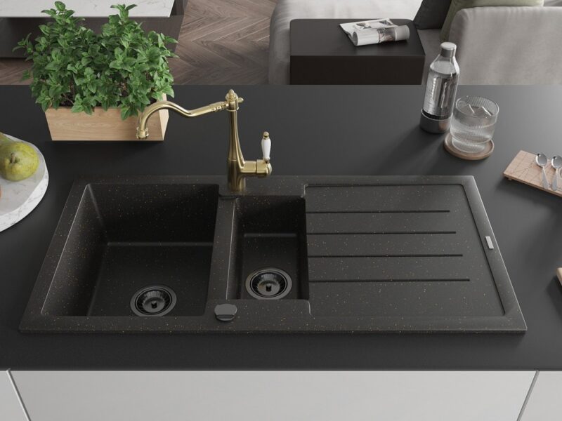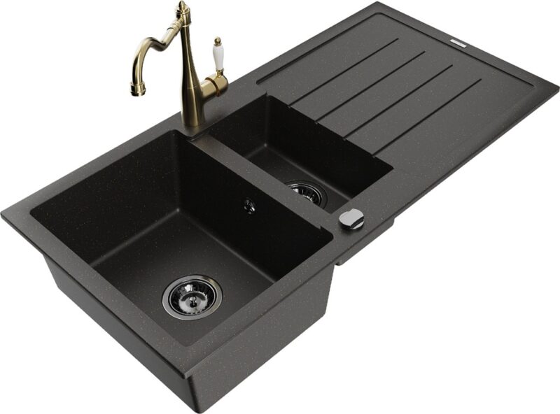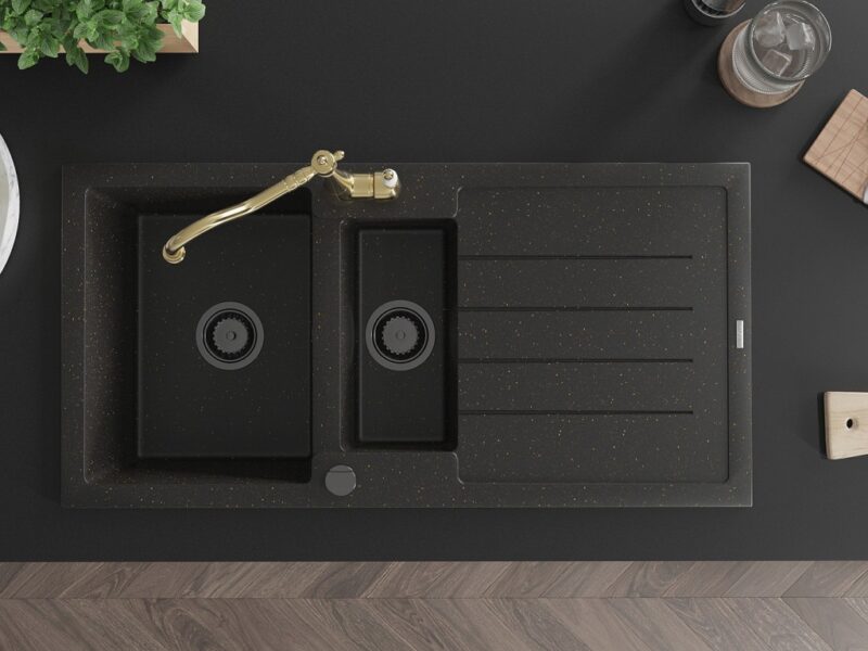 Drez: Rozmer: 1000x500x200 mm Hĺbka komory: 190 mm (väčšia), 115 mm (menšia) Rozmery komory: 430×330 mm (väčšie), 340×170 mm (menšie) Priemer odtoku: ø90 mm Typ: 1,5-miska s odkvapkávačom Typ: Zapustené do pracovnej dosky Farba: čierna / zlatá metalíza Povrchová úprava sifónu: čierna Materiál: žula (80% žulové kamenivo 20% živice) Prepadový otvor: Áno Otvory: (batérie, automat) 2 Inštalácia: Univerzálna, je možné inštalovať s odkvapkávačom na ľavú alebo pravú stranu Vysoká odolnosť proti poškriabaniu a zmene farby Odolnosť proti tepelným šokom Povrch pre ľahké čistenie Dva dodatočné vyfrézované otvory na samodierovanie ø35 Kuchynská batéria: Materiál: mosadz Farba: Zlatá Hlava: Keramická Perlátor: Áno Typ: Jednopákové Výška batérie: 290 mm Rozsah výtoku: 260 mm(GT) Ean: 5905315041418