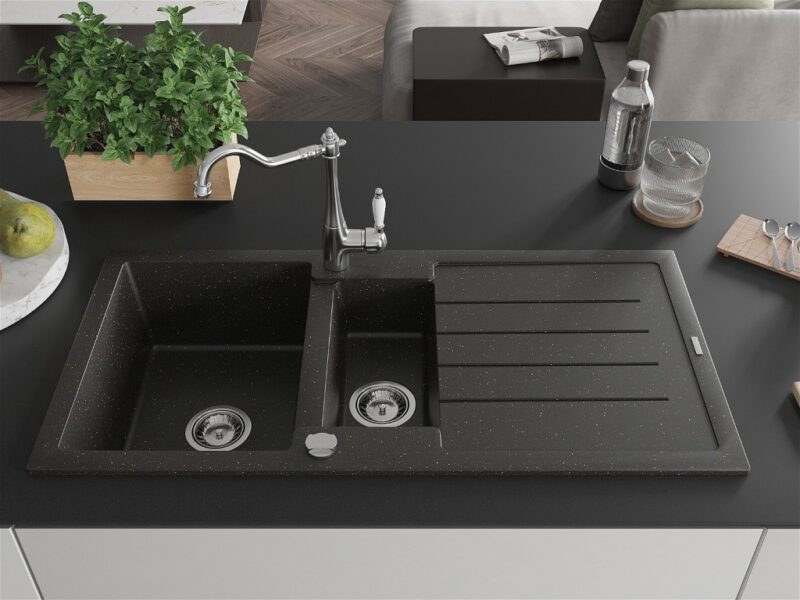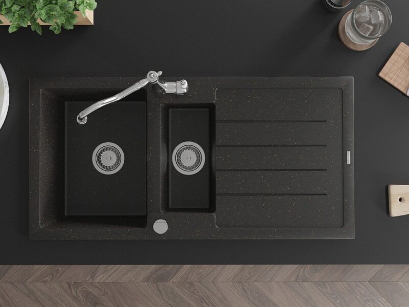 Drez: Rozmer: 1000x500x200 mm Hĺbka komory: 190 mm (väčšia), 115 mm (menšia) Rozmery komory: 430×330 mm (väčšie), 340×170 mm (menšie) Priemer odtoku: ø90 mm Typ: 1,5-miska s odkvapkávačom Typ: Zapustené do pracovnej dosky Farba: čierna / zlatá metalíza Povrchová úprava sifónu: Chrome Materiál: žula (80% žulové kamenivo 20% živice) Prepadový otvor: Áno Otvory: (batérie, automat) 2 Inštalácia: Univerzálna, je možné inštalovať s odkvapkávačom na ľavú alebo pravú stranu Vysoká odolnosť proti poškriabaniu a zmene farby Odolnosť proti tepelným šokom Povrch pre ľahké čistenie Dva dodatočné vyfrézované otvory na samodierovanie ø35 Kuchynská batéria: Materiál: mosadz Farba: Chrome Hlava: Keramická Perlátor: Áno Typ: Jednopákové Výška batérie: 290 mm Rozsah výtoku: 260 mm(GT) Ean: 5905315041395